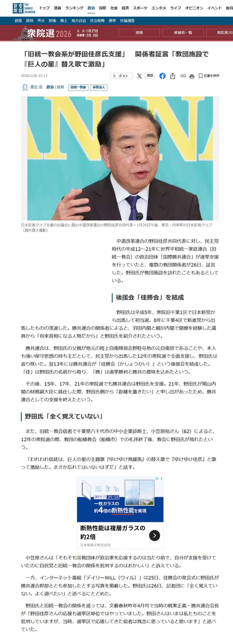 旧統一教会信者で千葉県八千代市の中小企業診断士、小笠原裕さん(62)によると、12年の衆院選の際、教団の船橋教会(船橋市)での礼拝終了後、教会に野田氏が現れたという。