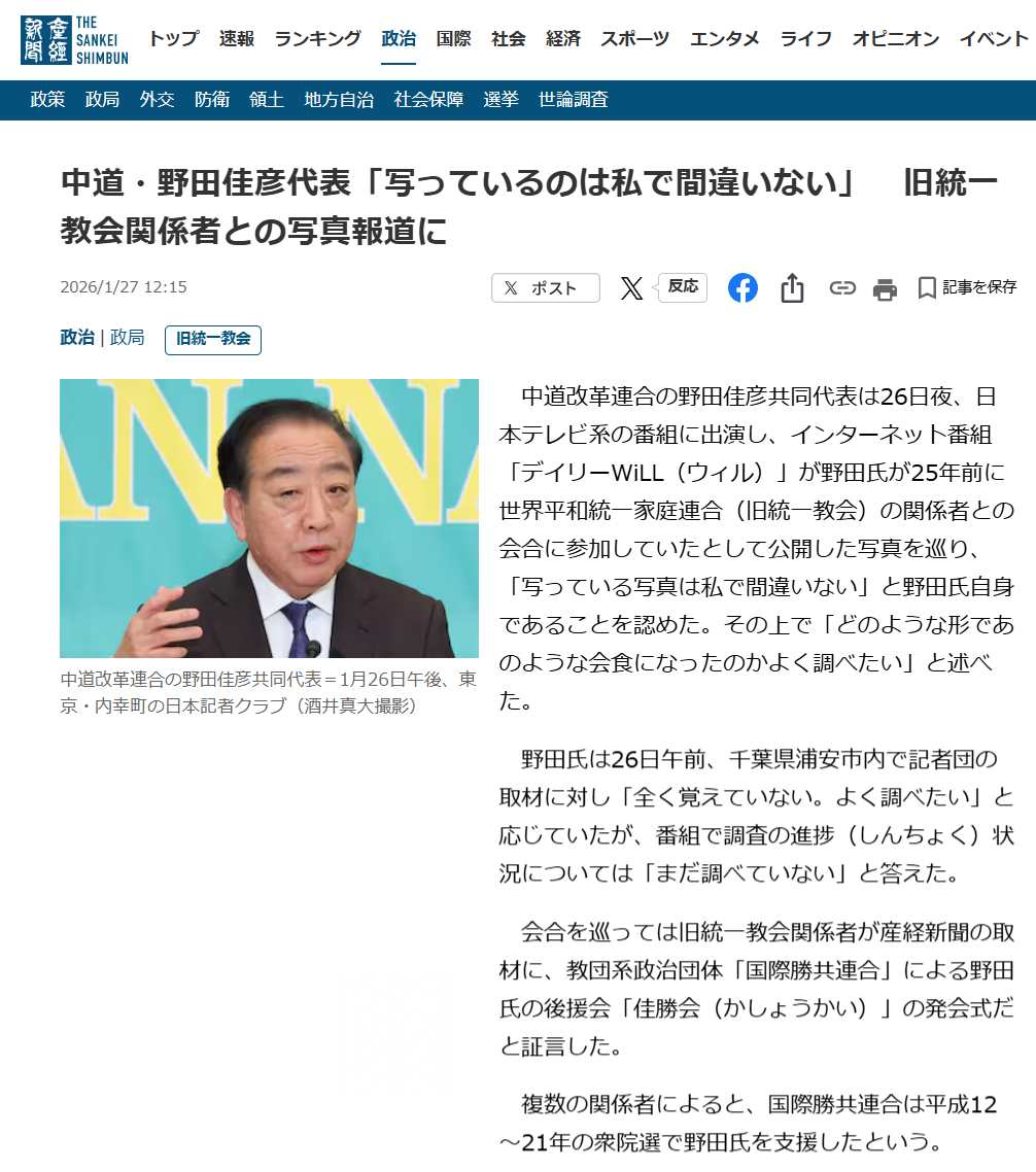 写真提供:2026/01/25【緊急スクープ】中道改革連合・野田佳彦共同代表「統一教会との蜜月」衝撃写真を暴露!【デイリーWiLL】