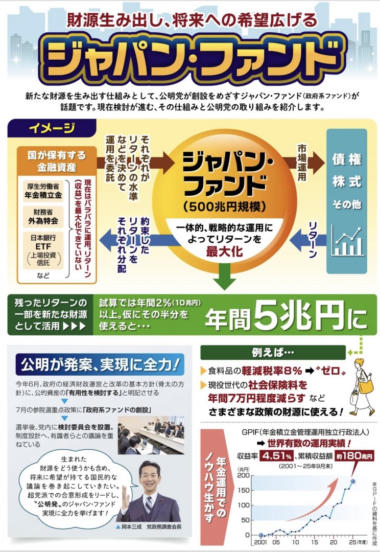 公明党はこの仕組みを「ジャパンファンド」と呼び、財源確保のための新たな仕組みとして創設を訴えています。